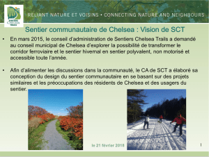 SCT collabore à la planification de ce sentier depuis ses débuts. En 2015, SCT a présenté au conseil et au personnel municipal un document expliquant sa vision dans le but de proposer une étude de faisabilité. Depuis cette date, il y a eu des consultations communautaires et des recherches qui ont permis de raffiner notre vision originale. Voici donc notre vision révisée du sentier qu’a préparée le CA de SCT en guise de contribution au processus de design du sentier.