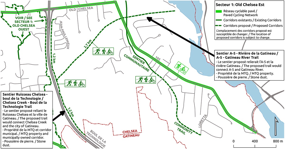 This project will allow for the construction of a dedicated, multi-purpose pathway to provide an active transportation   link between Chelsea's centre village and Boulevard de la Technologie in Gatineau located a few kilometers south.  The pathway, which will run along the right-of-way of Highway 5, will offer Chelsea residents new options for utilitarian and recreational use including a safe cycling connection to Gatineau and Ottawa.  This modal shift could reduce greenhouse gas (GHG) emissions by a few thousand tonnes of carbon dioxide (CO2).  In addition, approximately one hundred thousand dollars in expenses could be avoided by the citizens of Chelsea.